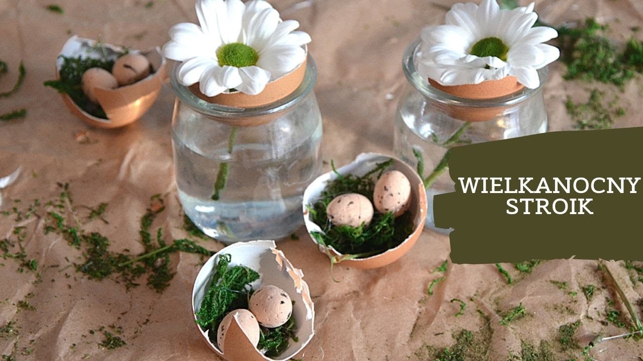 To bardzo prosta i minimalistyczna dekoracja. Nie potrzebujesz całych wydmuszek – zaledwie połówek skorupek jajka. Przy pomocy kleju na gorąco przymocuj mech, małe jajeczka, kwiatki i gałązki. Takie skorupkowe stroiki możesz wykorzystać jako elementy większej dekoracji : wianka, stroika, stołu.
