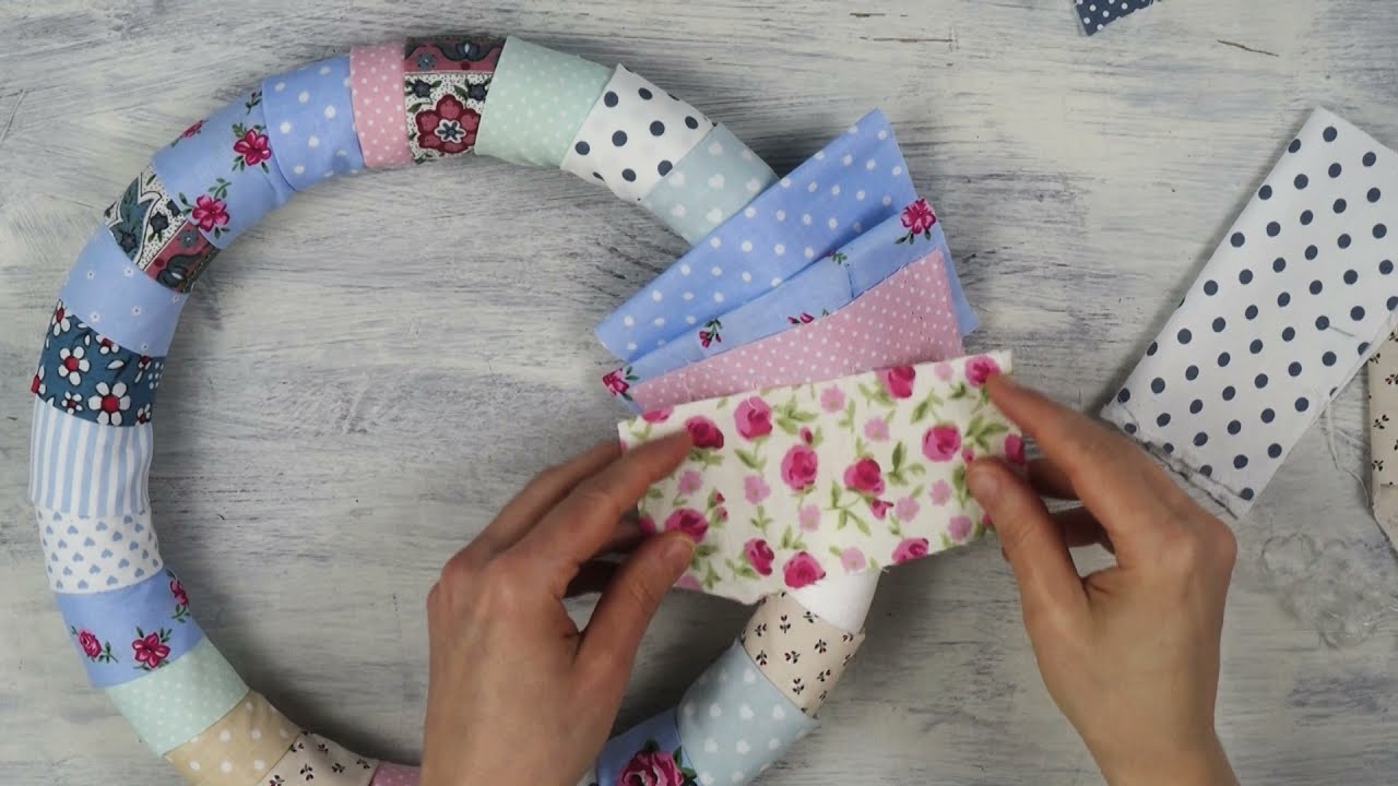 Na ten wianek potrzebujesz wiele resztek tkanin w podobnych tonacjach.